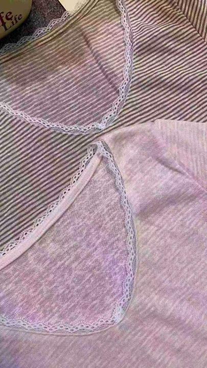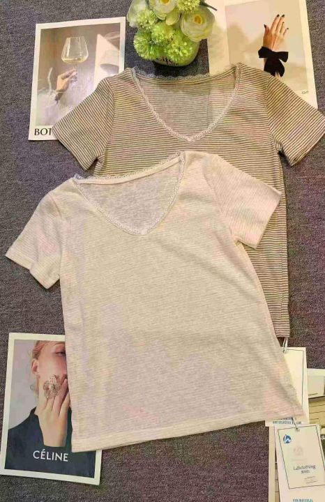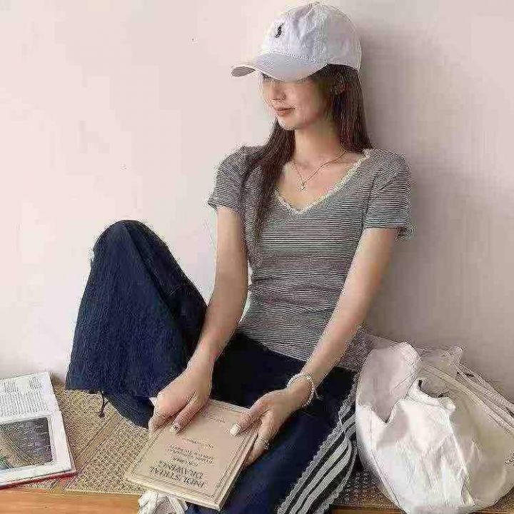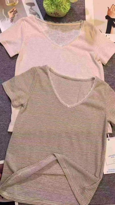 纯欲风甜辣小众条纹撞色蕾丝短袖,[爱心]60件左右,棕色为主,均码,穿80-130斤,万佳档口货,原包装️无瑕疵,[666]实体店品质