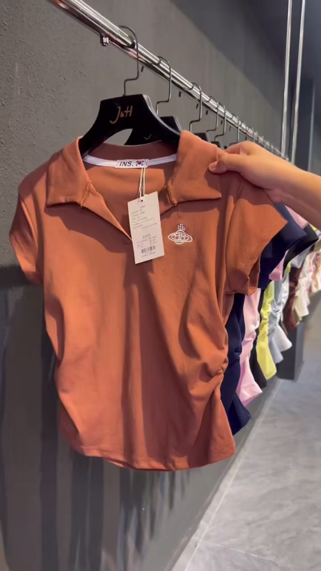 纯棉收腰polo领正肩短袖T恤女夏季甜辣妹显瘦短款刺绣V领上衣6680件全清11.8...