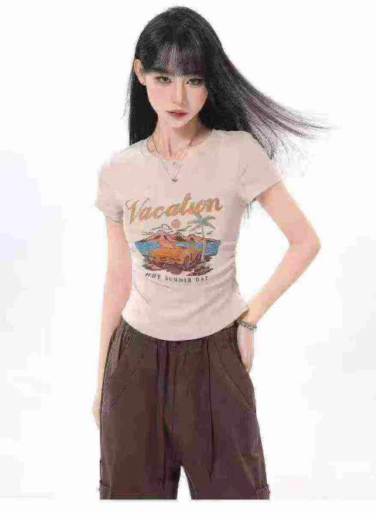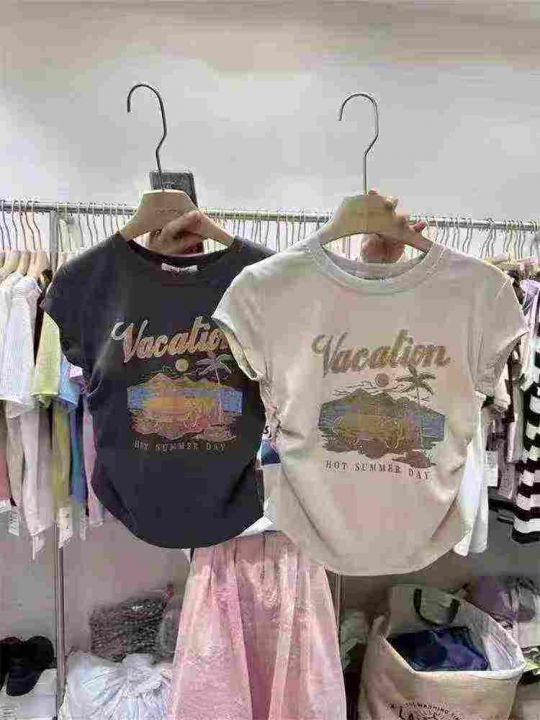 ☕️美式复古正肩短袖t恤夏季不规则设计感高腰收腰短...