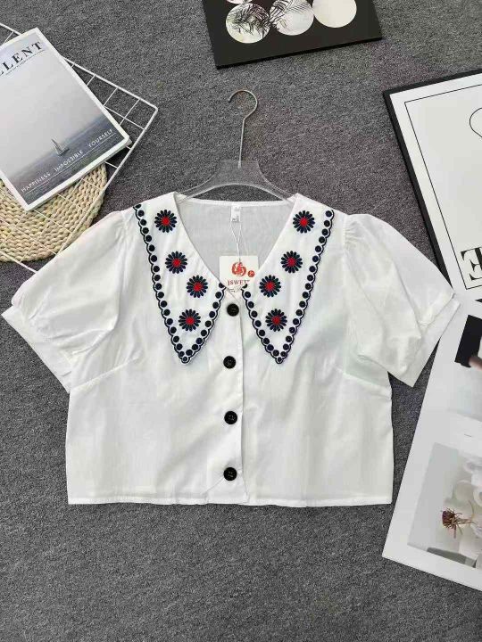 ☕️法式设计感绣花娃娃领泡泡袖小众宽松短袖衬衫女20...