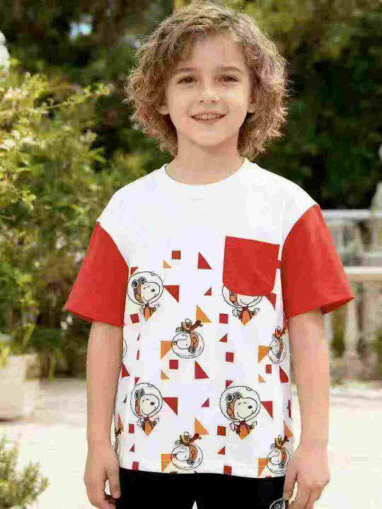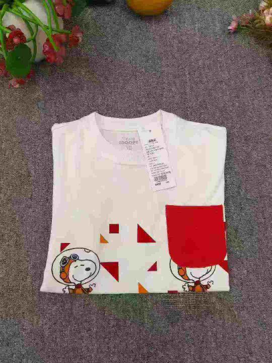 品牌史努比童装个性T恤短袖 尺码110--160 数量2000件左右 整款单色 胸前有口袋 后领包边 独立包装带吊牌 大货干净整洁