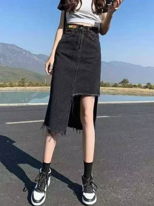 牛仔长裙不规则开叉牛仔半身裙女新款夏季高腰a字中长...