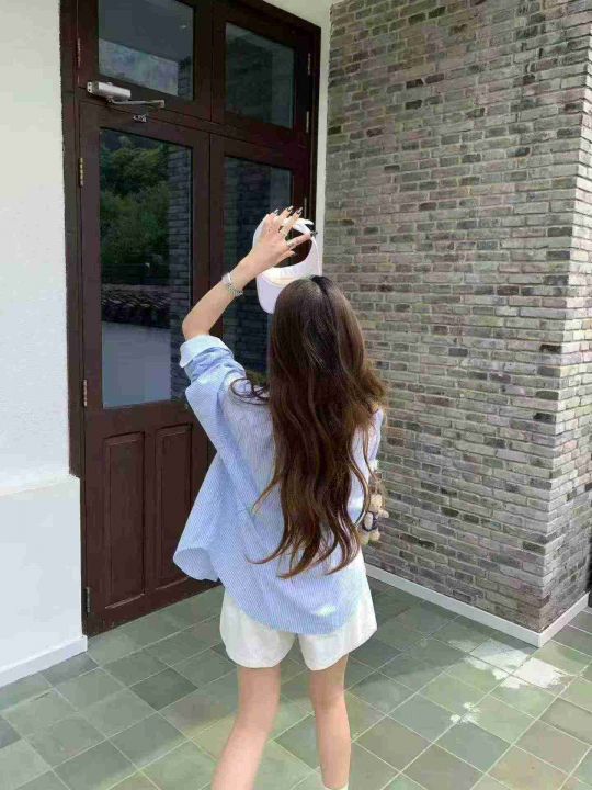 [月亮]:韩系港风蓝色条纹叠穿高级感休闲开衫衬衫