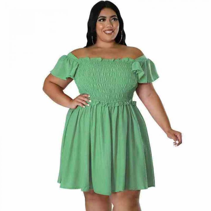 3000件左右,跨境欧美大码夏季女装一字领短袖大摆连衣裙精品华夫格短裙,独...