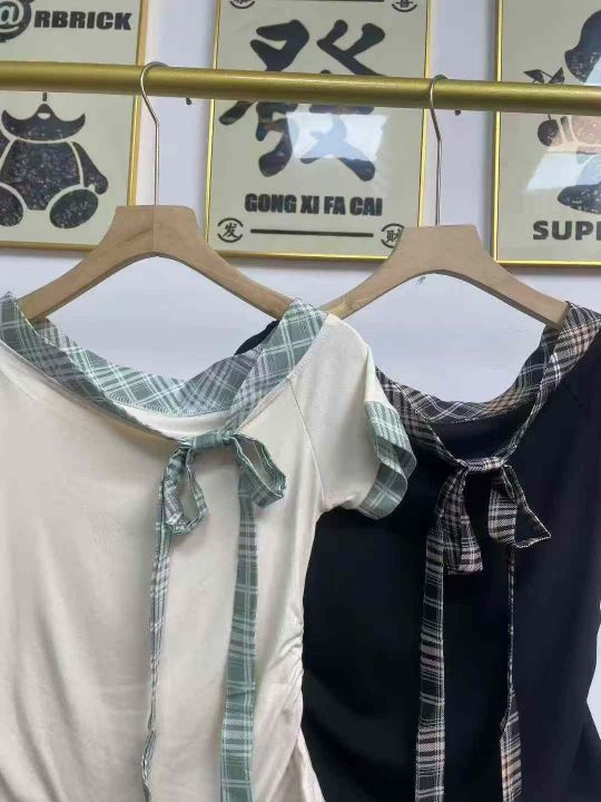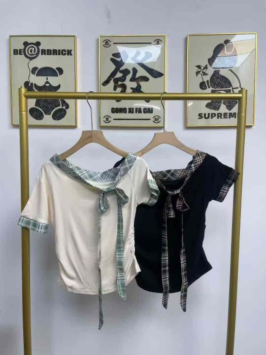 天猫在售款358件左右高品质夏季法系甜美风拼接条纹绑带蝴蝶结设计感漏肩上衣,码数M-L,单款两色,质量好,独立包装带吊牌