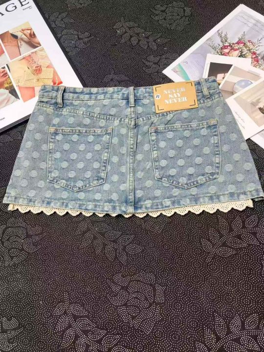 辣妹波点蕾丝花边带内衬牛仔短裙 101件,全清9.8元,正品独立包装,货品干净,码数:S/M/L。