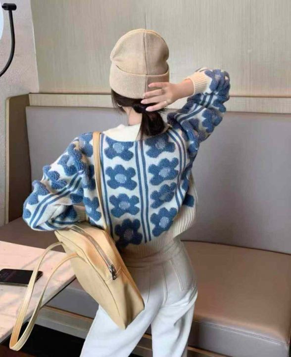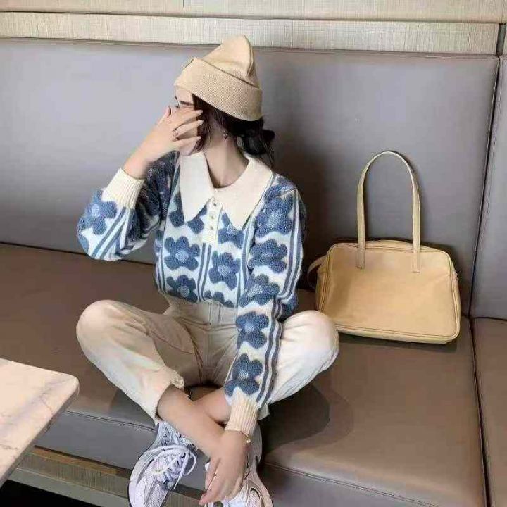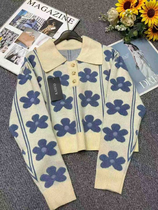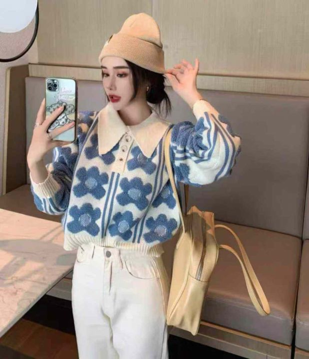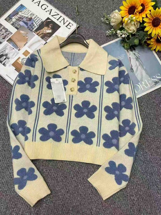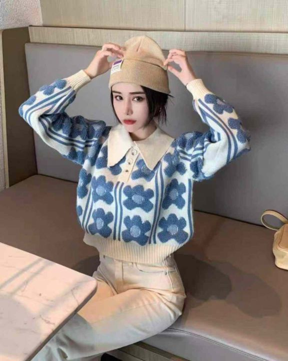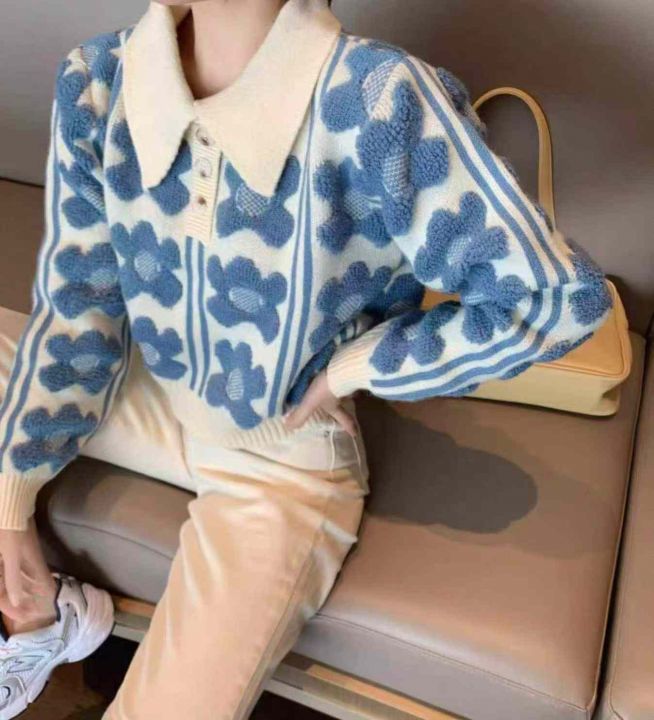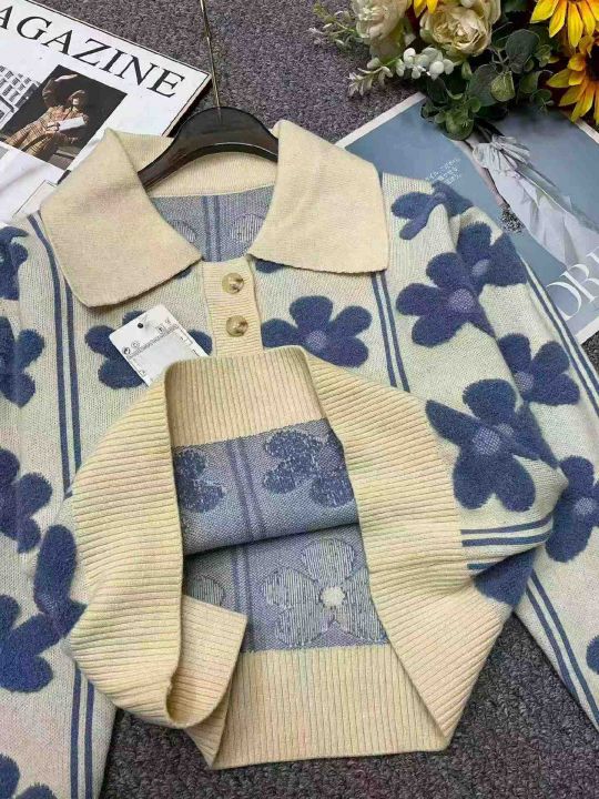 秋冬新款美单甜美少女系显白温暖提花Polo领套头毛衣,...
