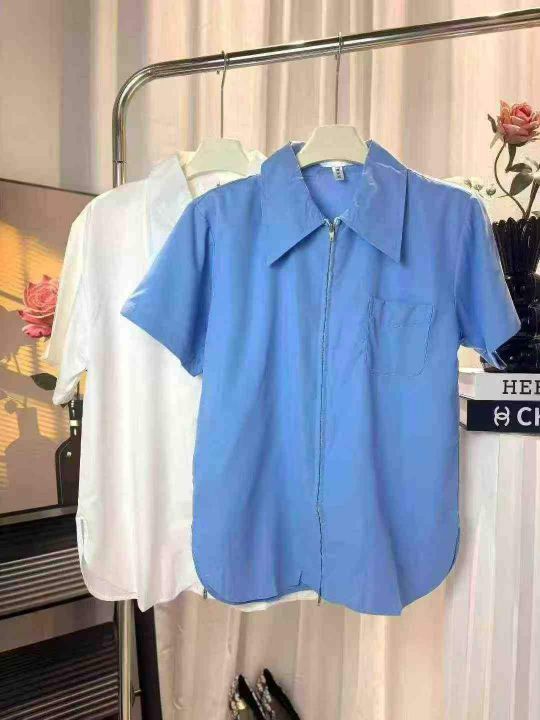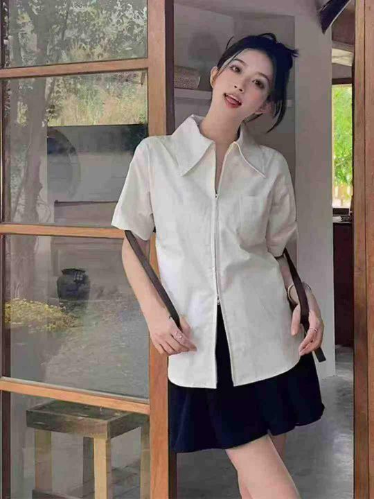 大码法式设计感双拉链POLO领长短袖衬衫女春夏薄款衬衣...