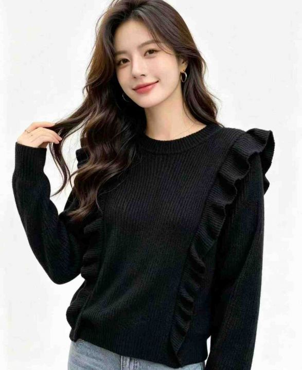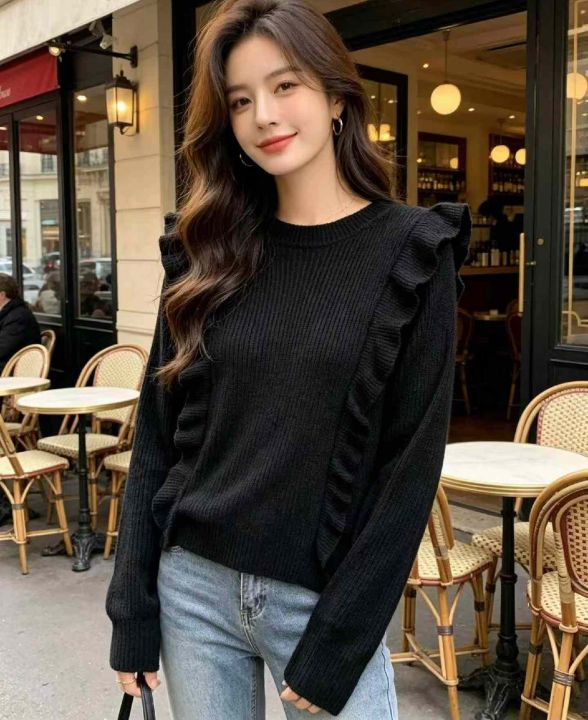 春季新款复古法式宽松百搭显瘦木耳边设计款圆领套头毛衣,独立包装带吊牌,...