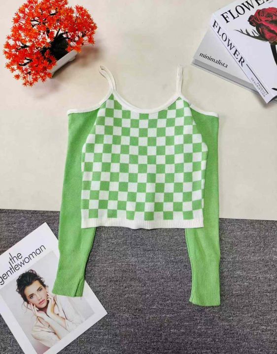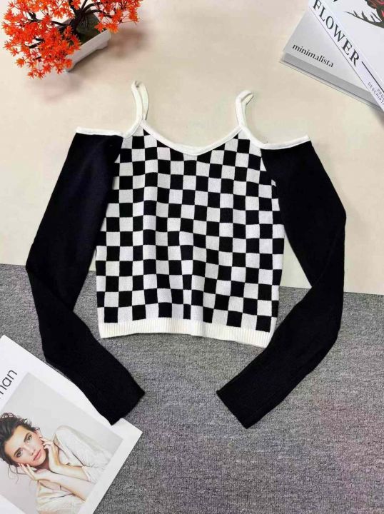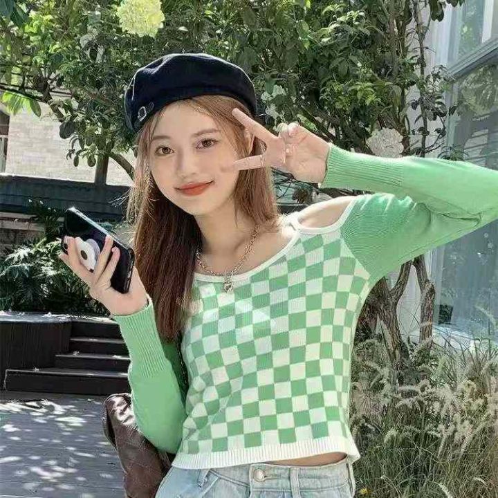 800件 春秋时尚格子露肩提花性感长袖上衣打底衫女,...