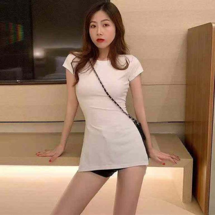 夏季韩版新款弹力修身性感开叉中长款圆领短袖纯色T桖...