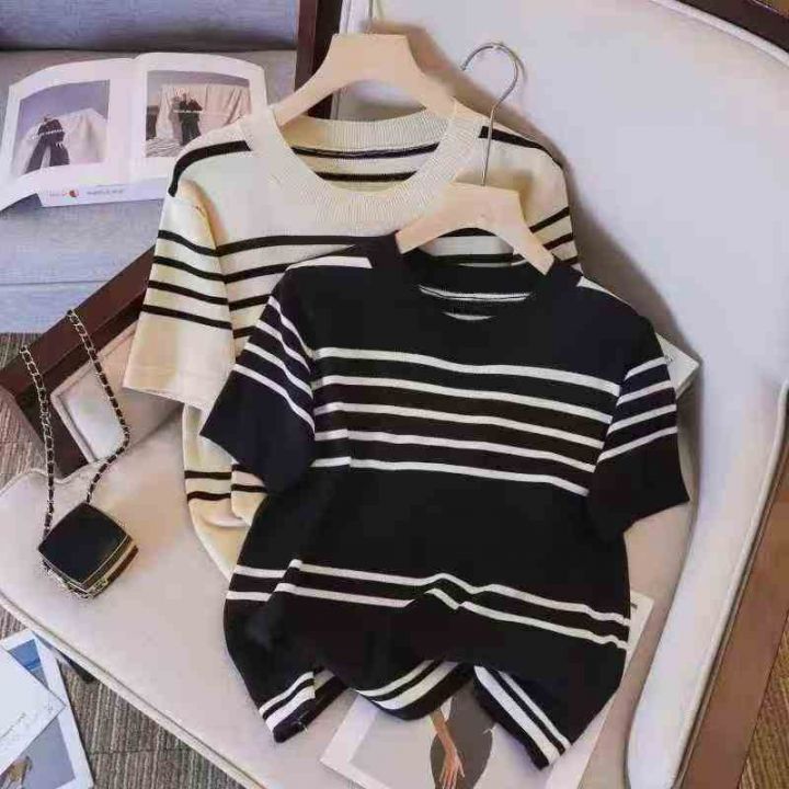 450件靓女条纹针织短袖T恤,夏季薄款,冰丝面料,穿着...