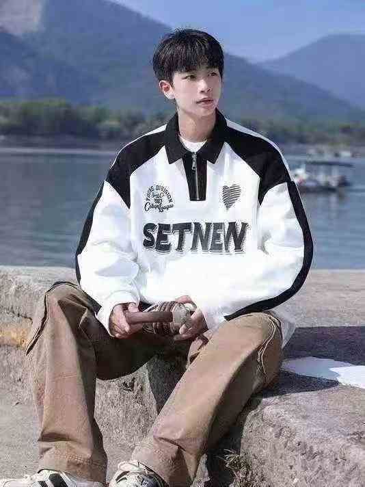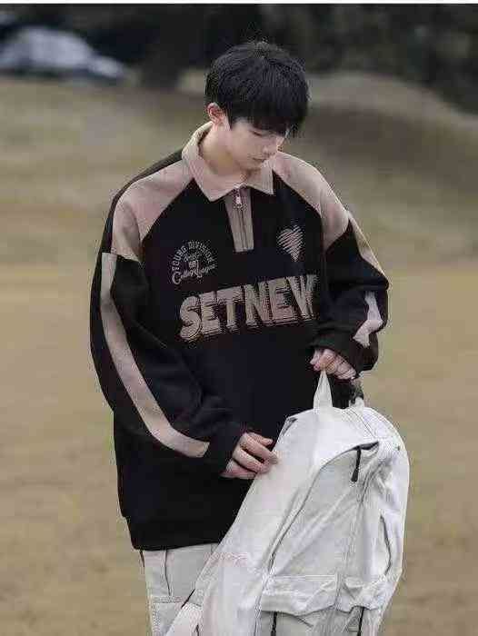 polo半拉链复古潮牌青少年宽松拼接翻领男士卫衣外套·...