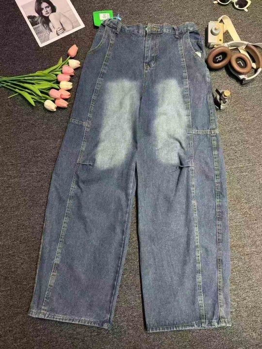 580件韩系松弛感复古做旧小辣妹高腰直筒烟灰色阔腿休闲牛仔裤,尺码2-5(S-X...