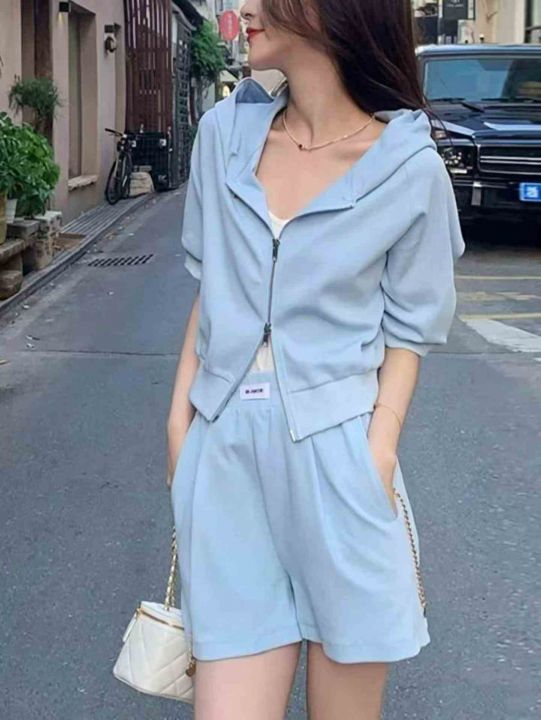 ① 夏季新款盐系拉链连帽外套短裤套装!独立包装,码数S-2XL,整款两色,数...