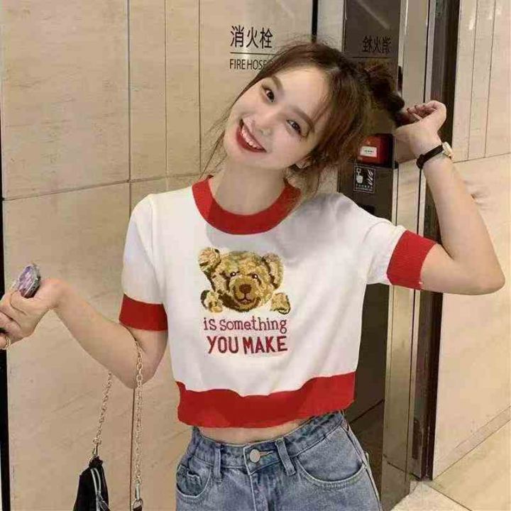 481件小熊刺绣针织网红短袖,红白撞色,均码110斤左右...