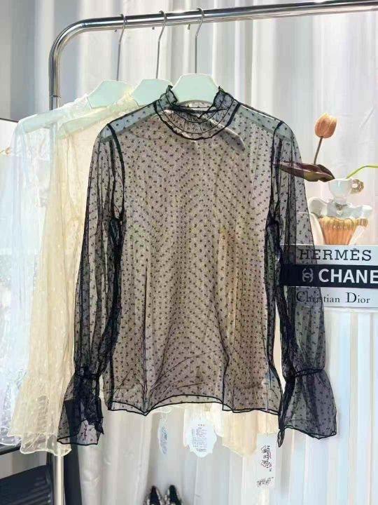 270件春装新款蕾丝波点网纱打底衫女内搭超仙喇叭袖纱...