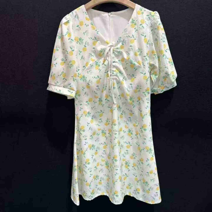 女装连衣裙整垮辣妹装大童装清新黄绿碎花前胸绑带背后拉链连衣裙