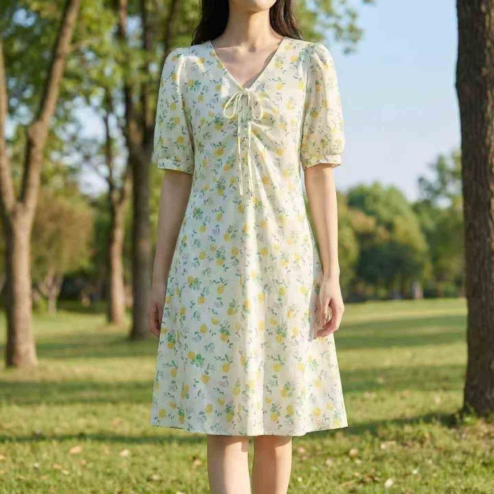 女装连衣裙整垮辣妹装大童装清新黄绿碎花前胸绑带背后拉链连衣裙