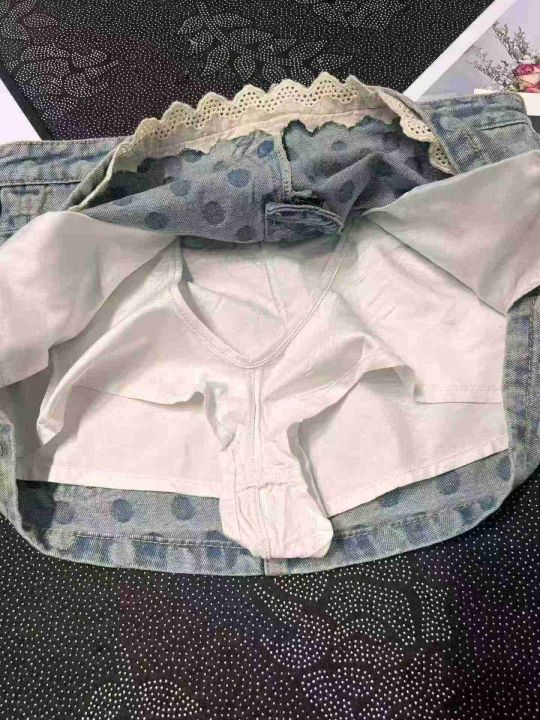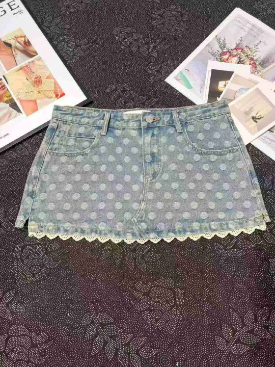 辣妹波点蕾丝花边带内衬牛仔短裙 101件,全清9.8元,正品独立包装,货品干净,码数:S/M/L。