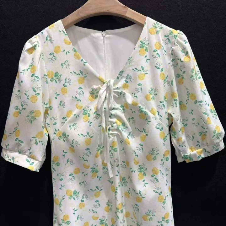 女装连衣裙整垮辣妹装大童装清新黄绿碎花前胸绑带背后拉链连衣裙