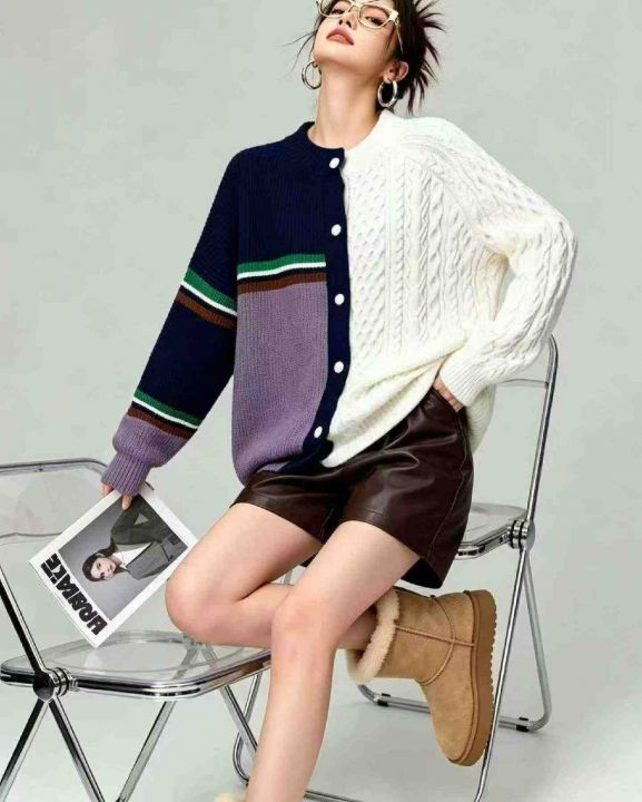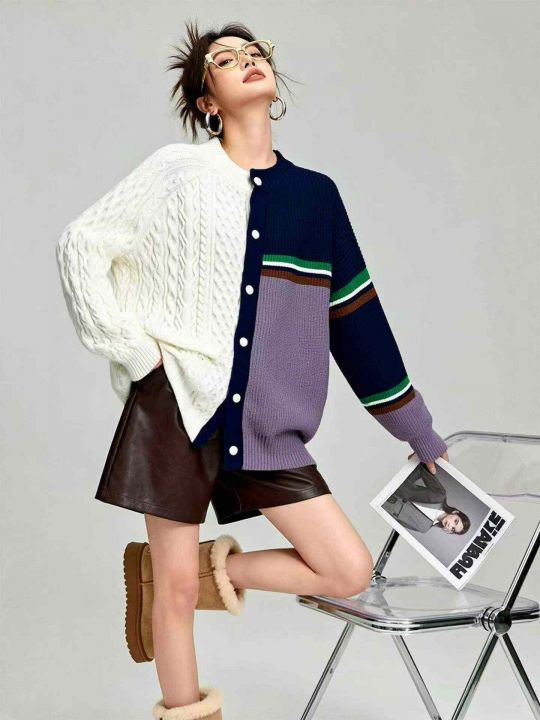 秋冬新款复古撞色拼接设计款麻花慵懒风毛衣开衫外套,...