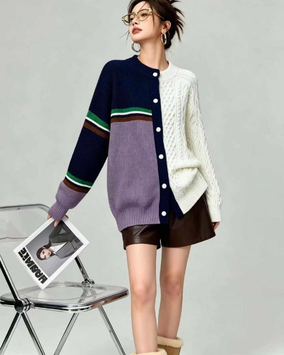 秋冬新款复古撞色拼接设计款麻花慵懒风毛衣开衫外套,...