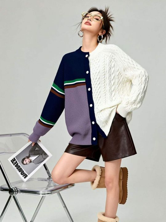 秋冬新款复古撞色拼接设计款麻花慵懒风毛衣开衫外套,...