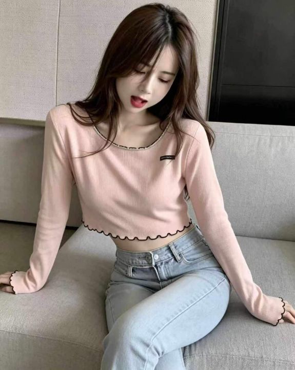 春夏季新款纯欲辣妹一字领小标设计感薄款针织长袖衫,独立包装,均码面料柔...
