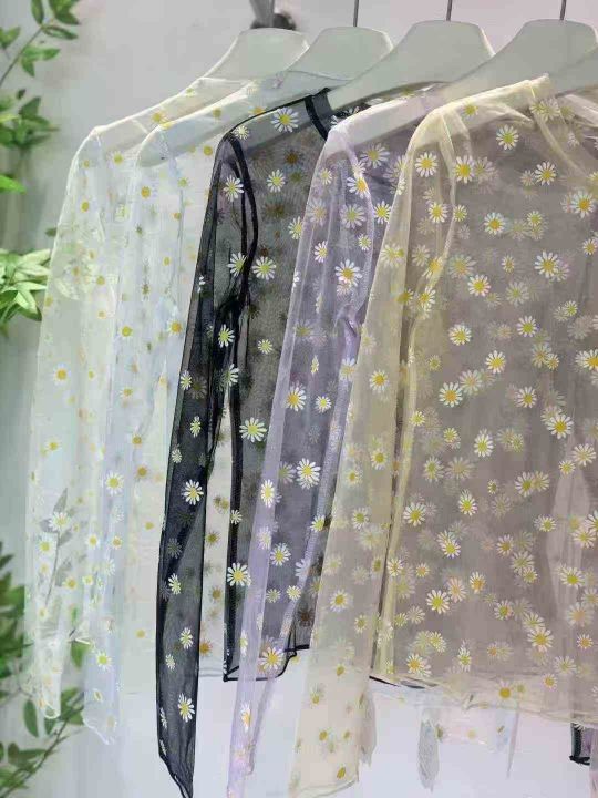 430件小雏菊网纱打底衫蕾丝t恤靓妹款夏季防晒叠穿纱衣...