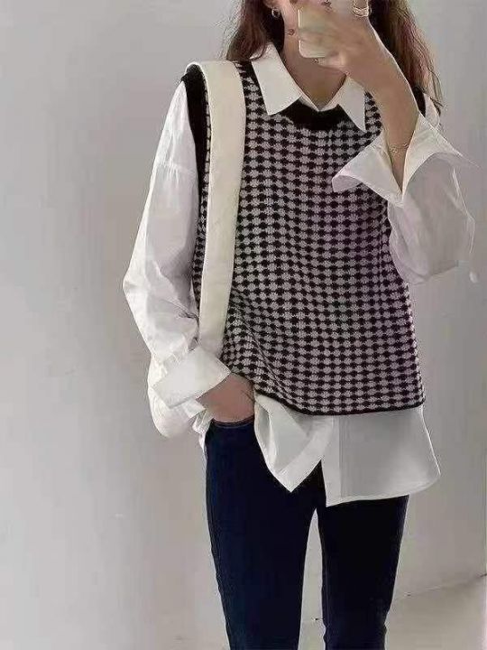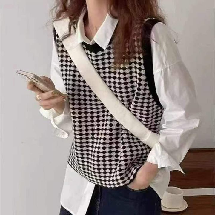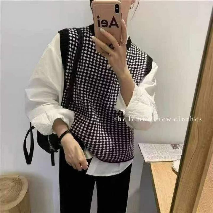 秋季新款韩版复古撞色提花宽松叠穿针织毛衣马甲背心,...