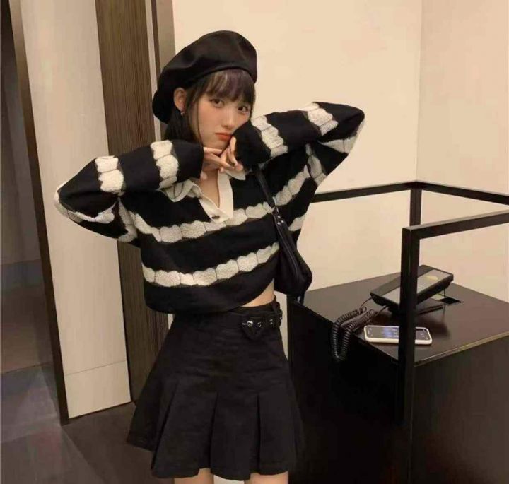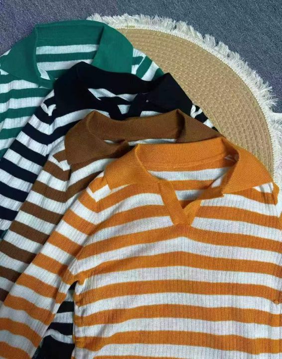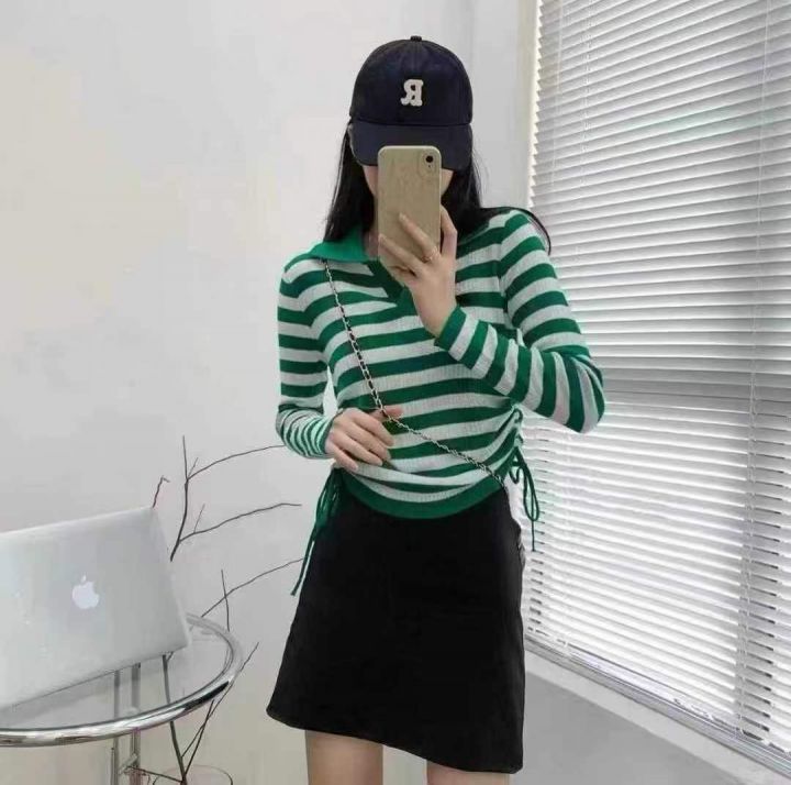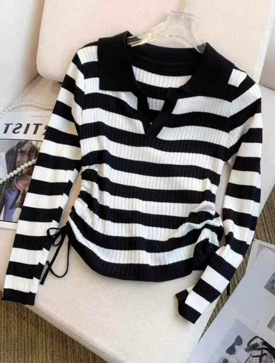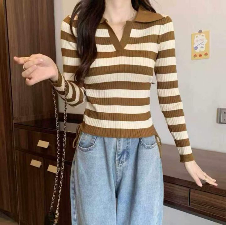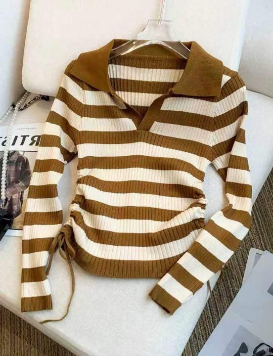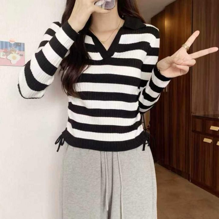 法式高级2025秋装新款韩版翻领条纹抽绳修身打底衫上衣...