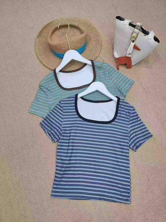 [月亮]:复古撞色U领正肩条纹T恤