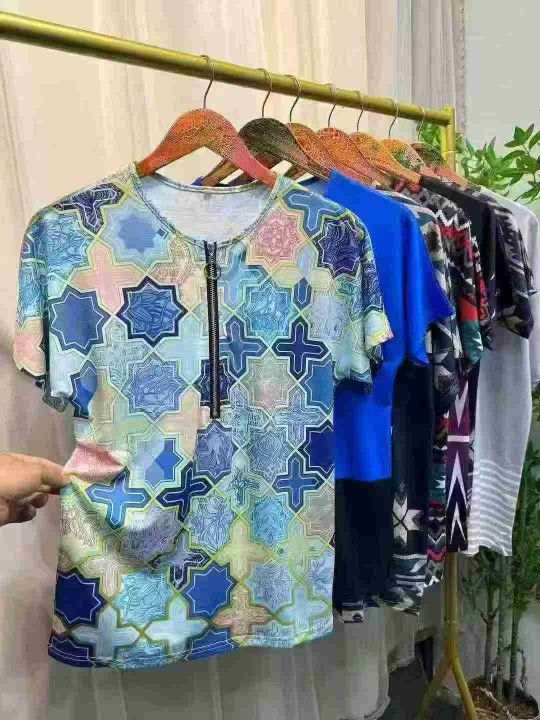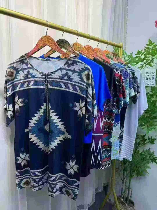 1500件,夏季欧美热销wish 独立站女民族风印花棉短袖v领拉链T恤上衣,独立包装,S-5XL,分货➕1,货号001#30