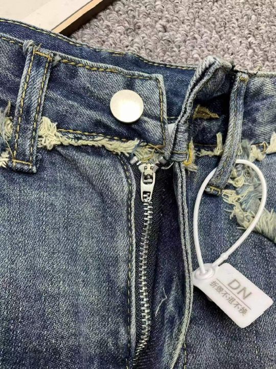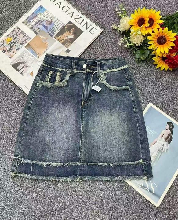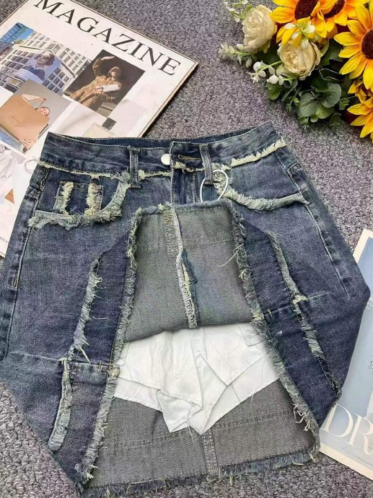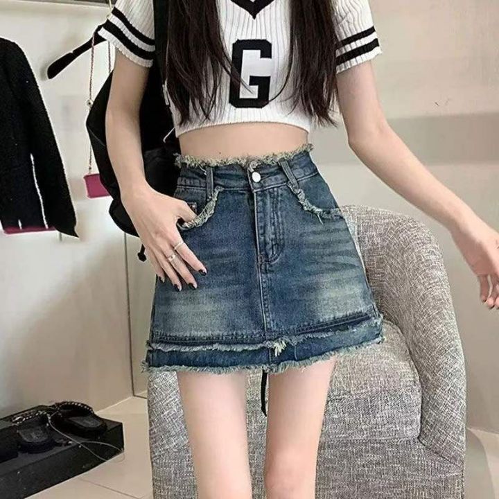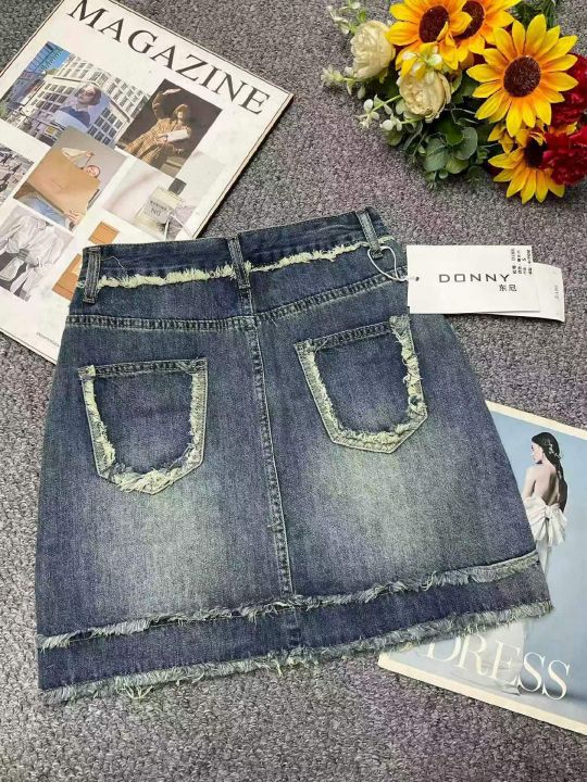 夏季新款毛边设计款复古百搭高腰洗水棉牛仔半身裙套,...