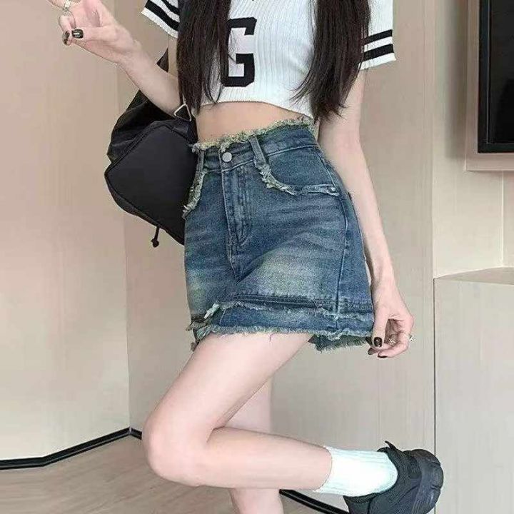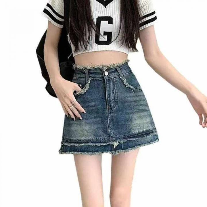 夏季新款毛边设计款复古百搭高腰洗水棉牛仔半身裙套,...