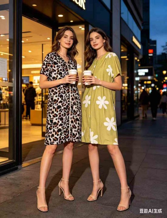 全清价6.8休闲长拉链印花气质宽松前开叉连衣裙,独立...