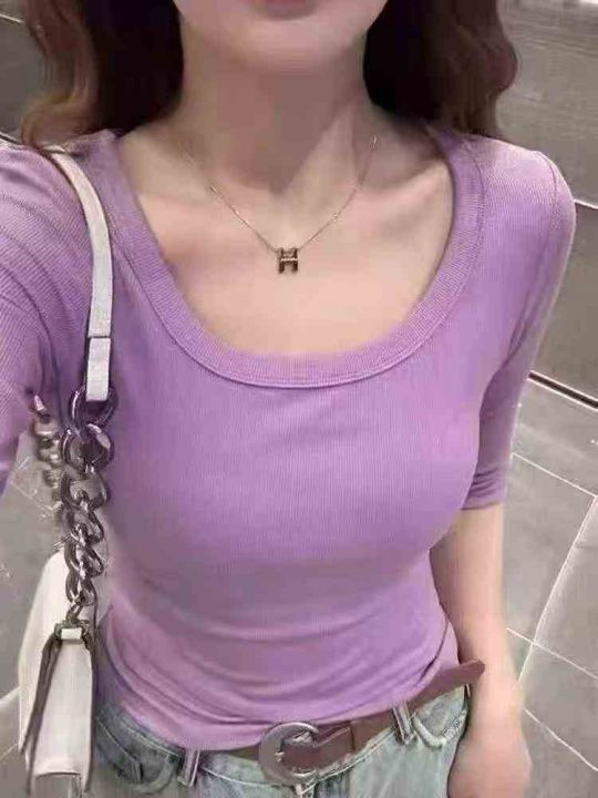 夏季新款五分袖U领螺纹t恤百搭修身显瘦时尚中袖打底衫994件,s~2XL独立包装...