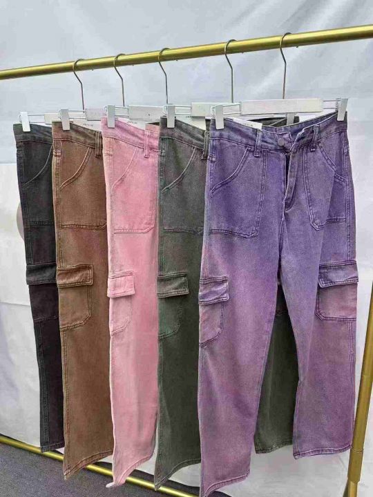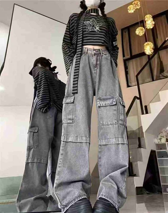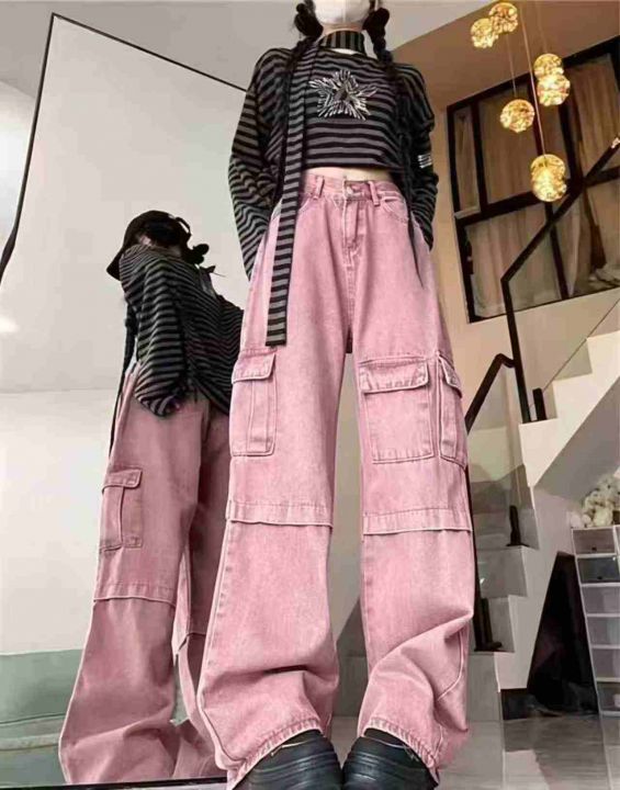 美式复古多口袋工装牛仔裤女高腰宽松阔腿裤子,单款5...