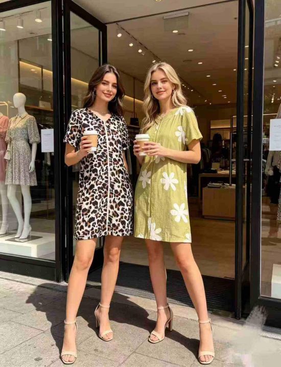休闲长拉链印花气质宽松前开叉连衣裙,独立包装,整款两花色,M码裙长90厘米,码数S-3XL,数量305