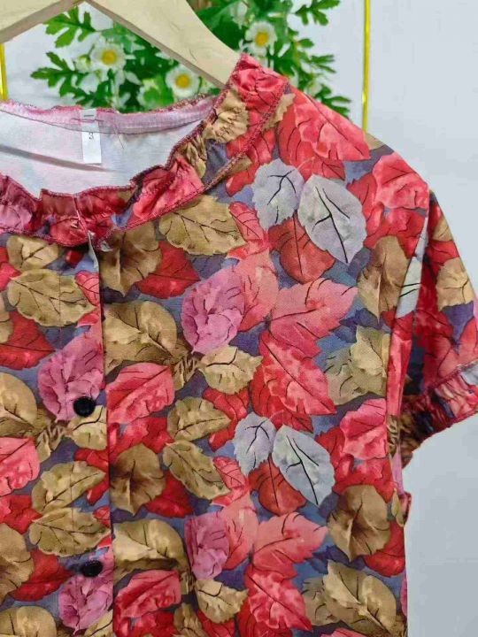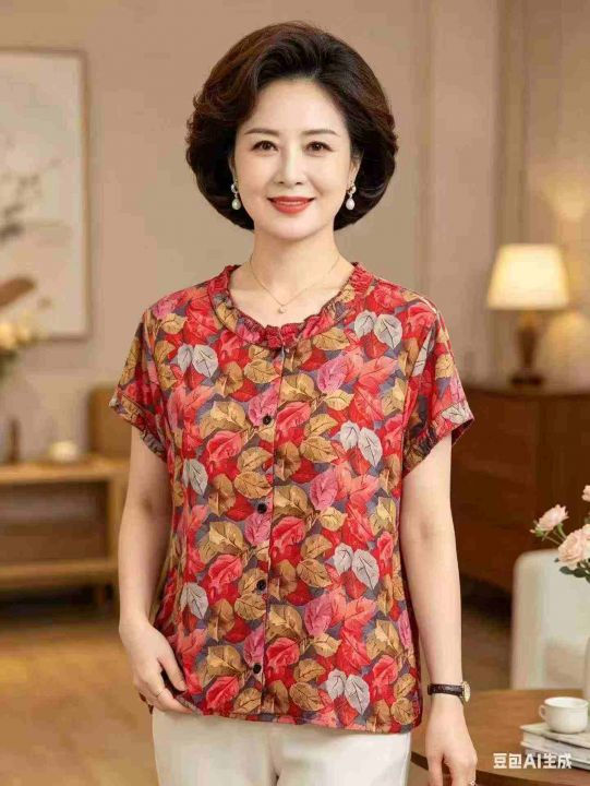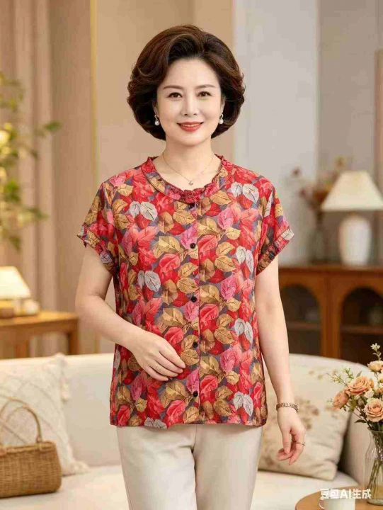 妈妈装枫叶印花木耳边短袖衬衫女2026夏季新款小衫宽松...