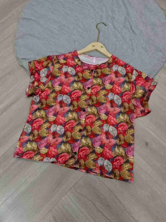 妈妈装枫叶印花木耳边短袖衬衫女2026夏季新款小衫宽松显瘦上衣