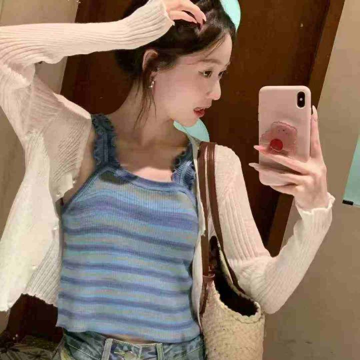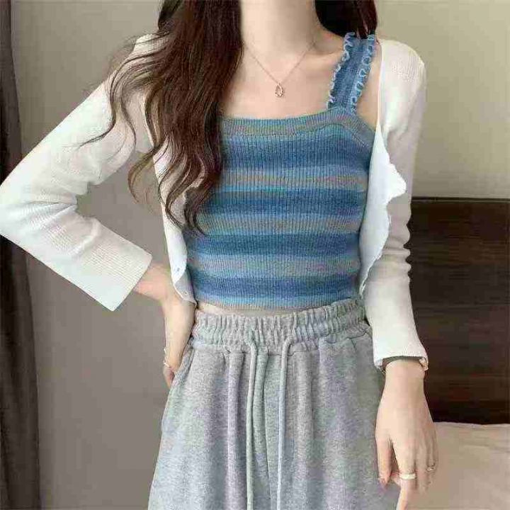 1478件针织吊带背心,条纹木耳边设计,一款7色,超弹力,穿着舒服,修身显瘦,夏天外穿打底都合适,均码110斤左右,全清4.8元,分货1