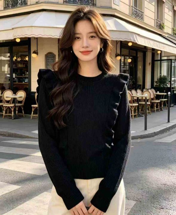 春季新款复古法式宽松百搭显瘦木耳边设计款圆领套头毛...