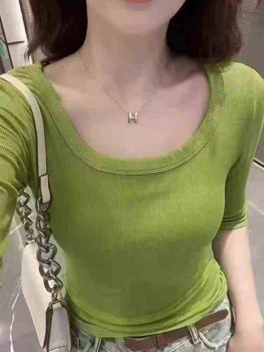 夏季新款五分袖U领螺纹t恤百搭修身显瘦时尚中袖打底衫...