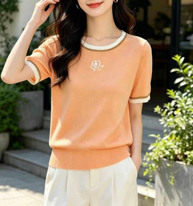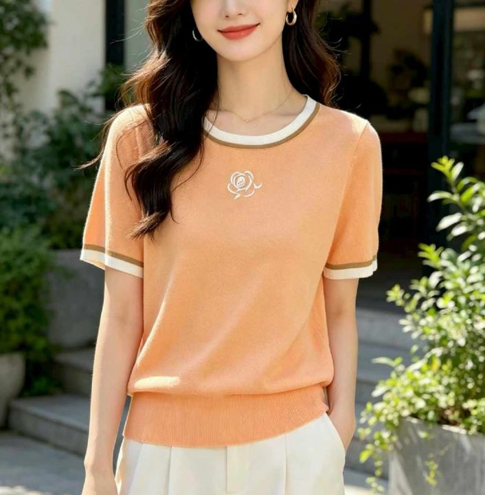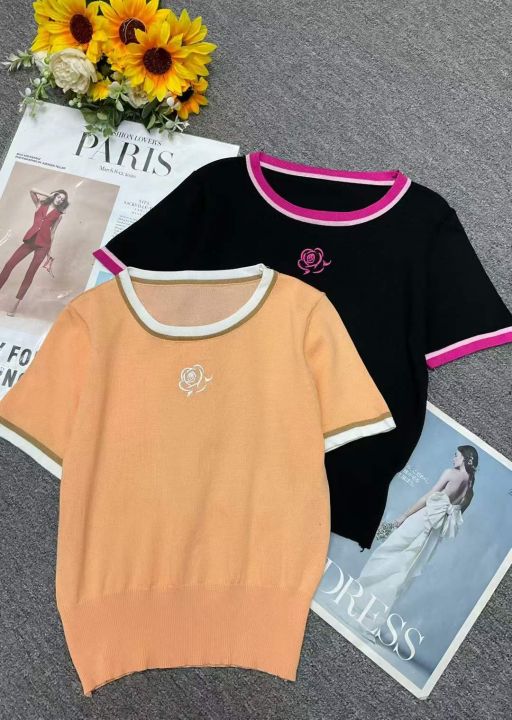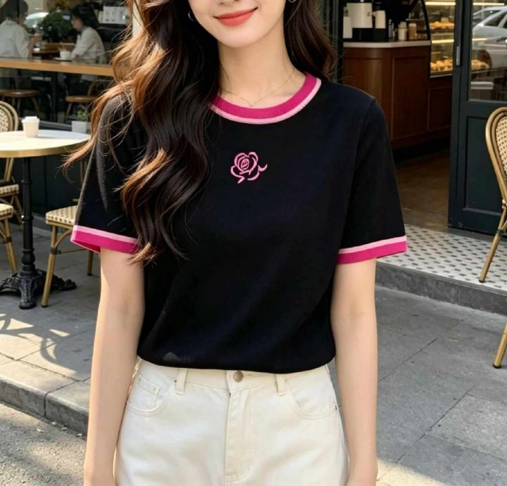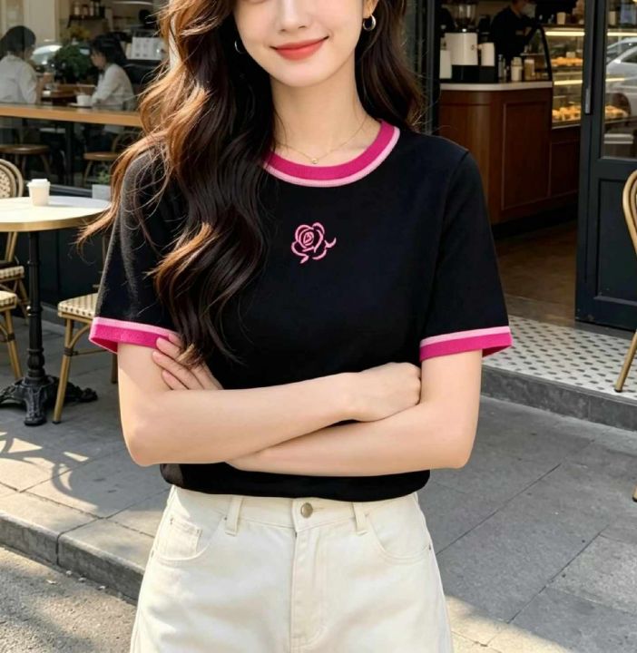 夏季新款撞色边玫瑰刺绣收腰显瘦针织短袖t桖,独立包装,均码面料柔软舒适弹力大,180件,全清5.9元超低价秒杀!