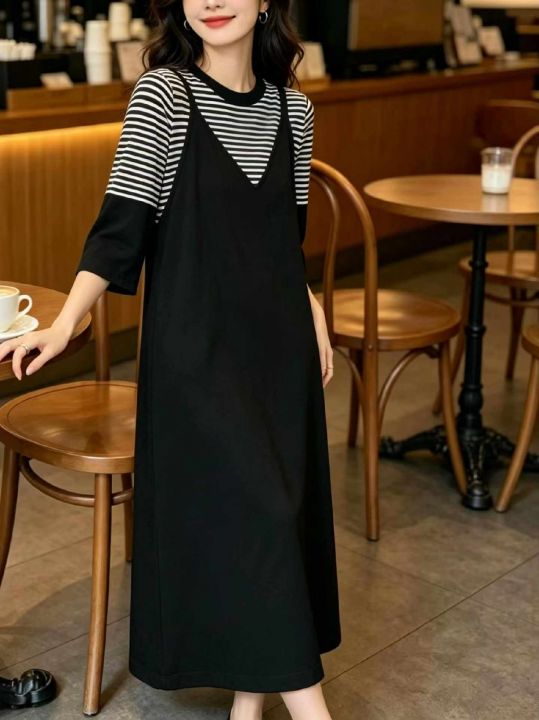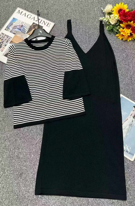 捡漏款,春夏季新款韩系撞色条纹针织吊带连衣裙+撞色条纹针织衫2件套,独立包装,均码面料柔软舒适有弹力,63套,全清9.9元超低价秒杀!