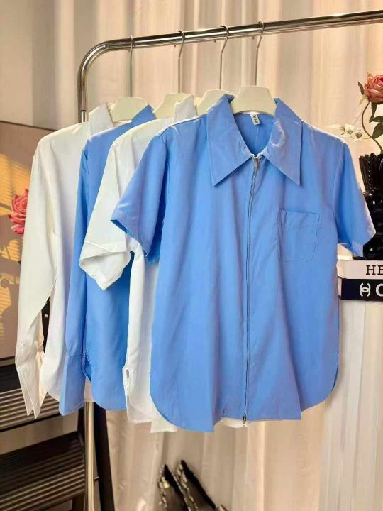 大码法式设计感双拉链POLO领长短袖衬衫女春夏薄款衬衣...