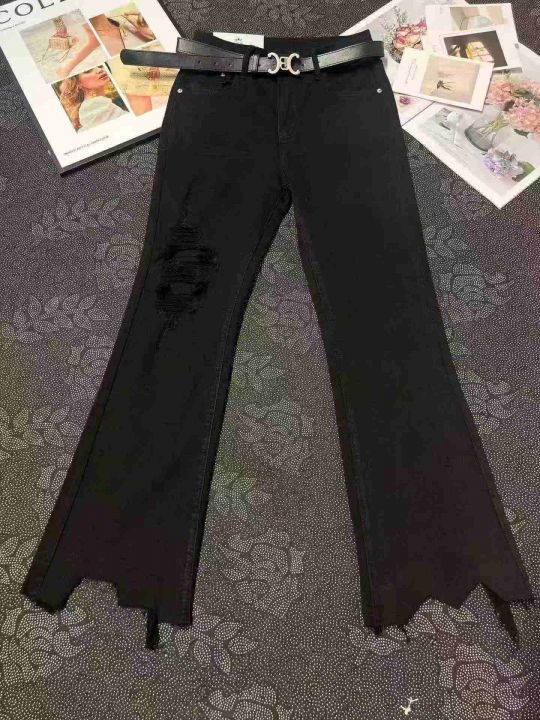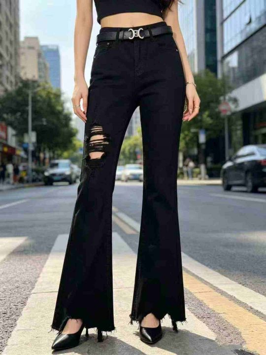 黑色个性破洞弹力微喇叭牛仔裤 111件,全清11.8元,每条带皮带,正品独立包装,货品干净,码数S到XL,夏季新款 不规则破洞微喇叭打底裤子女薄款弹力牛仔裤