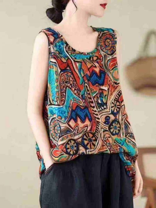 大码宽松遮肉中老年妈妈装打底衫无袖棉麻上衣女复古国...